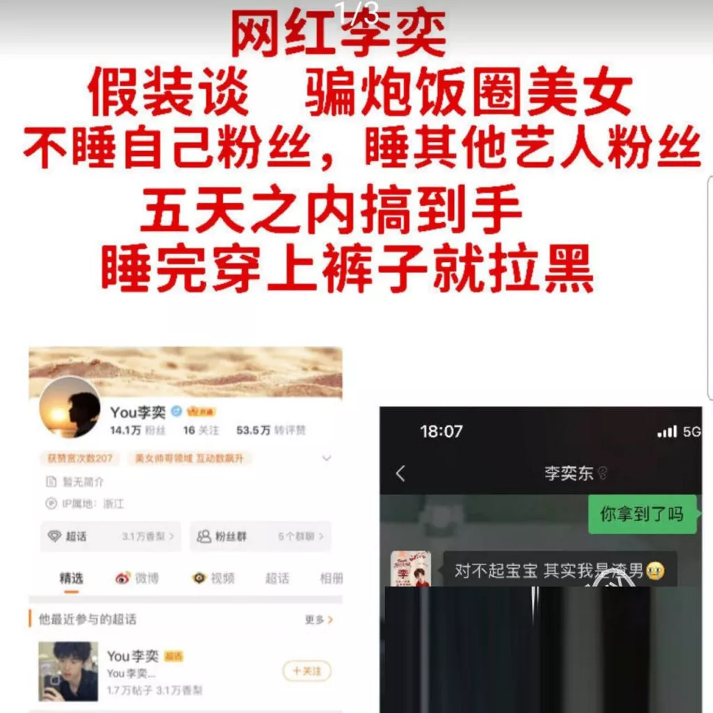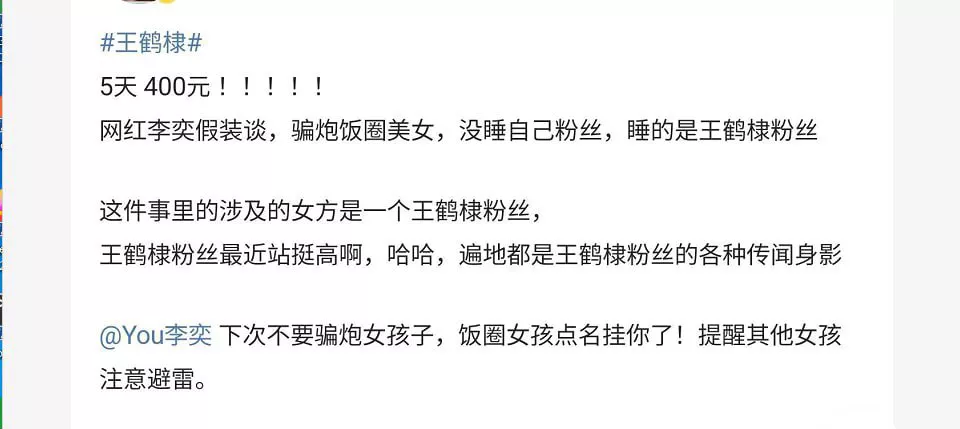 事情还是挺乱的,这位200万粉丝的男网红倒是明白兔子不吃窝边草这个道理。然后去骗了另一位大网红王鹤棣女粉丝,以恋爱为名义pua女粉丝,在相处的5天时间里就把女生骗的团团转,女生甚至幻想之后可以拍摄情侣风格的视频,没想到在献出了自己之后,这位渣男光速跑路拉黑消失。