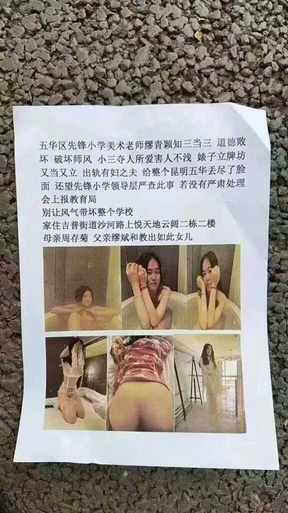 云南昆明先锋小学美术教师缪青颖,师德严重败坏,被曝光知三当三,苦主将这位人渣教师的罪证印刷成册,在校内传播。表面看着兢兢业业的教师,私底下竟然吸引已婚男教师,而学校领导知道此事后并无任何处理声明。