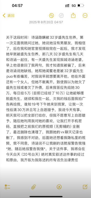 而这位诗涵,在被包养的事情败露后,竟然利用男主齐砾的同情心,谎称自己是被pua长期控制,前后骗取男主70多万现金,甚至报警男主齐砾强迫行为