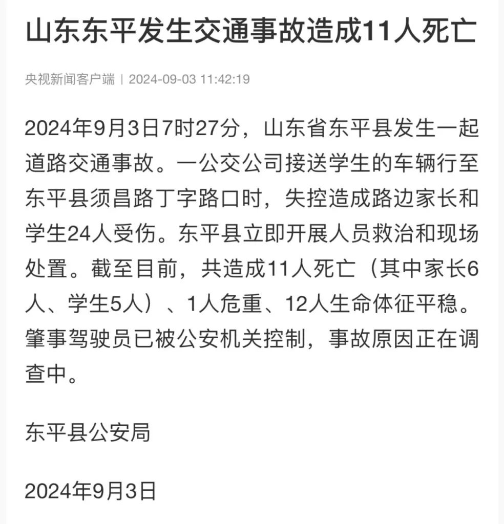 9月3日,山东泰安东平县。今晨,在佛山中学门口发生了一起严重的交通事故。一辆接送学生的定制公交车突然失控,冲入了正前往学校的学生人群。目前,事故造成十余名学生伤亡,具体情况正在进一步调查中。